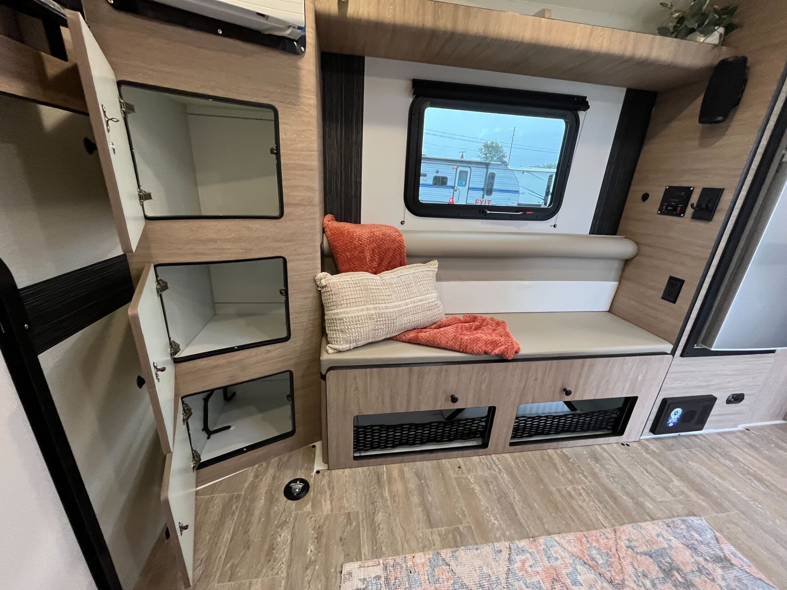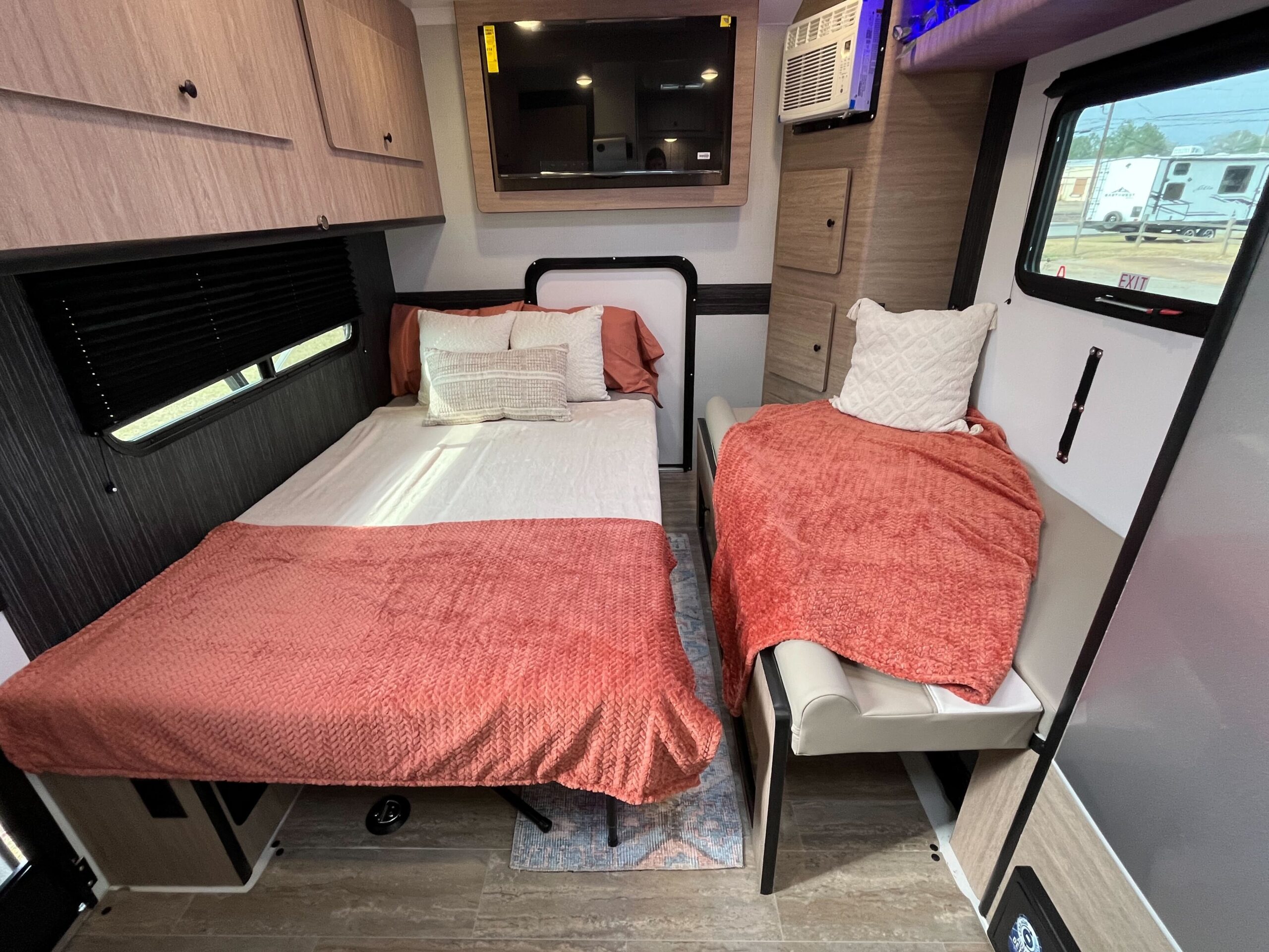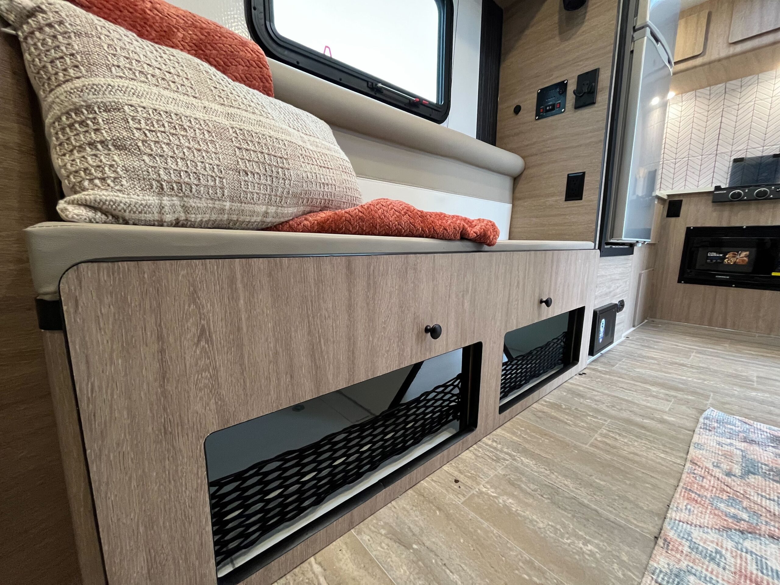 GOUCHO SOFA THAT CONVERTS INTO A BED, FULL-SIZE RV MURPHY BED, BICYCLE DOOR, TONS OF STORAGE, TIE DOWNS FOR BICYCLES.