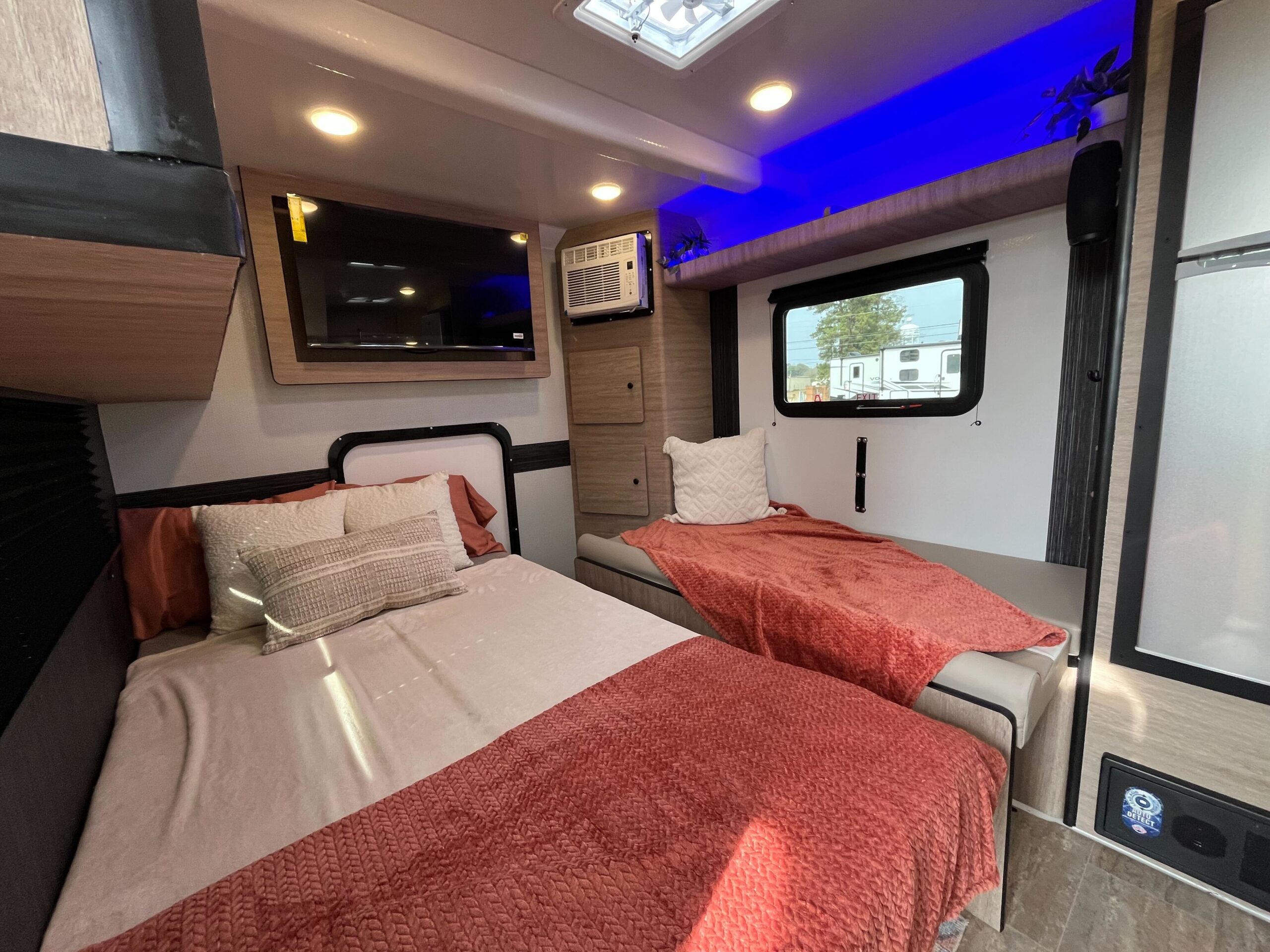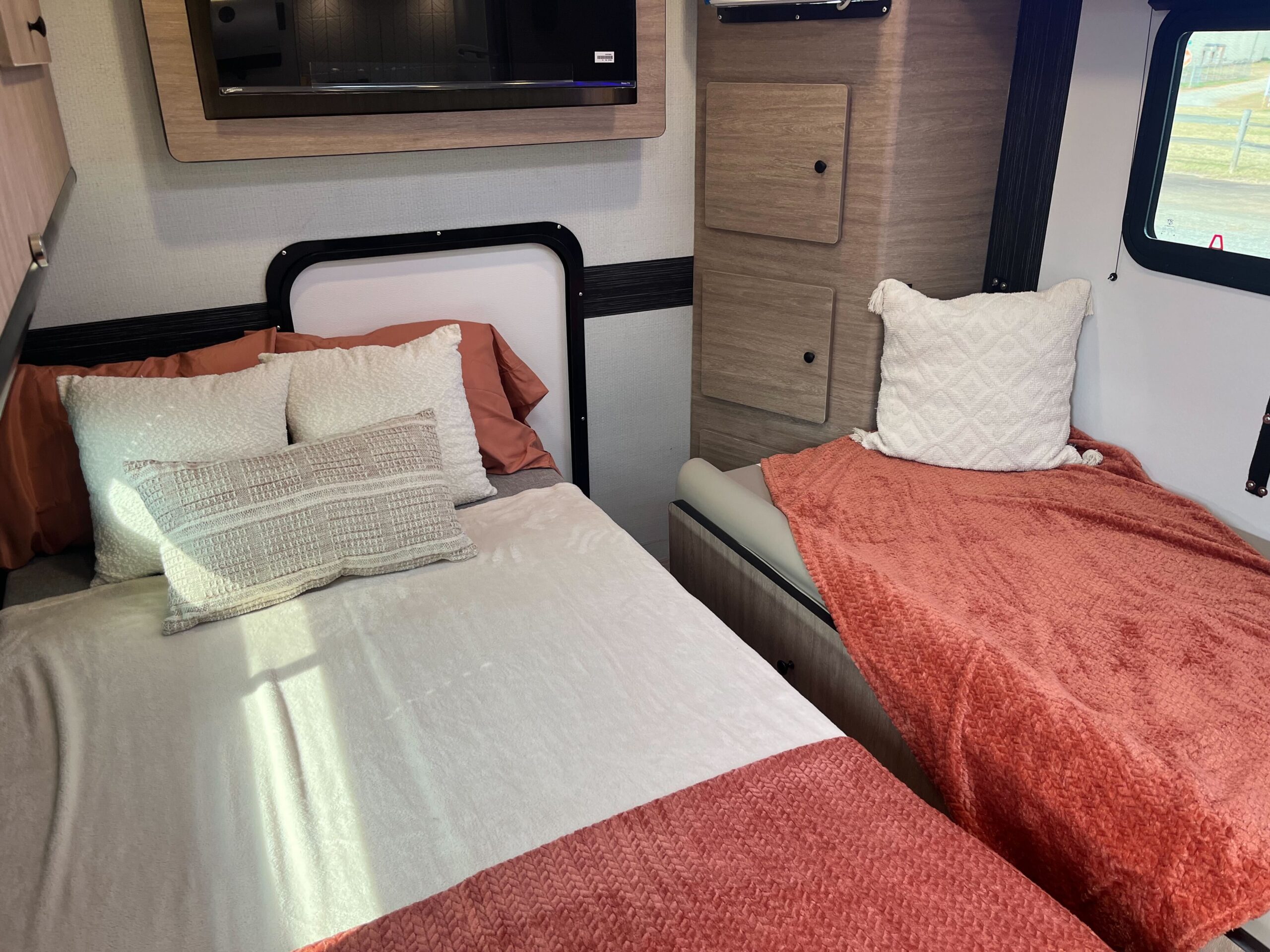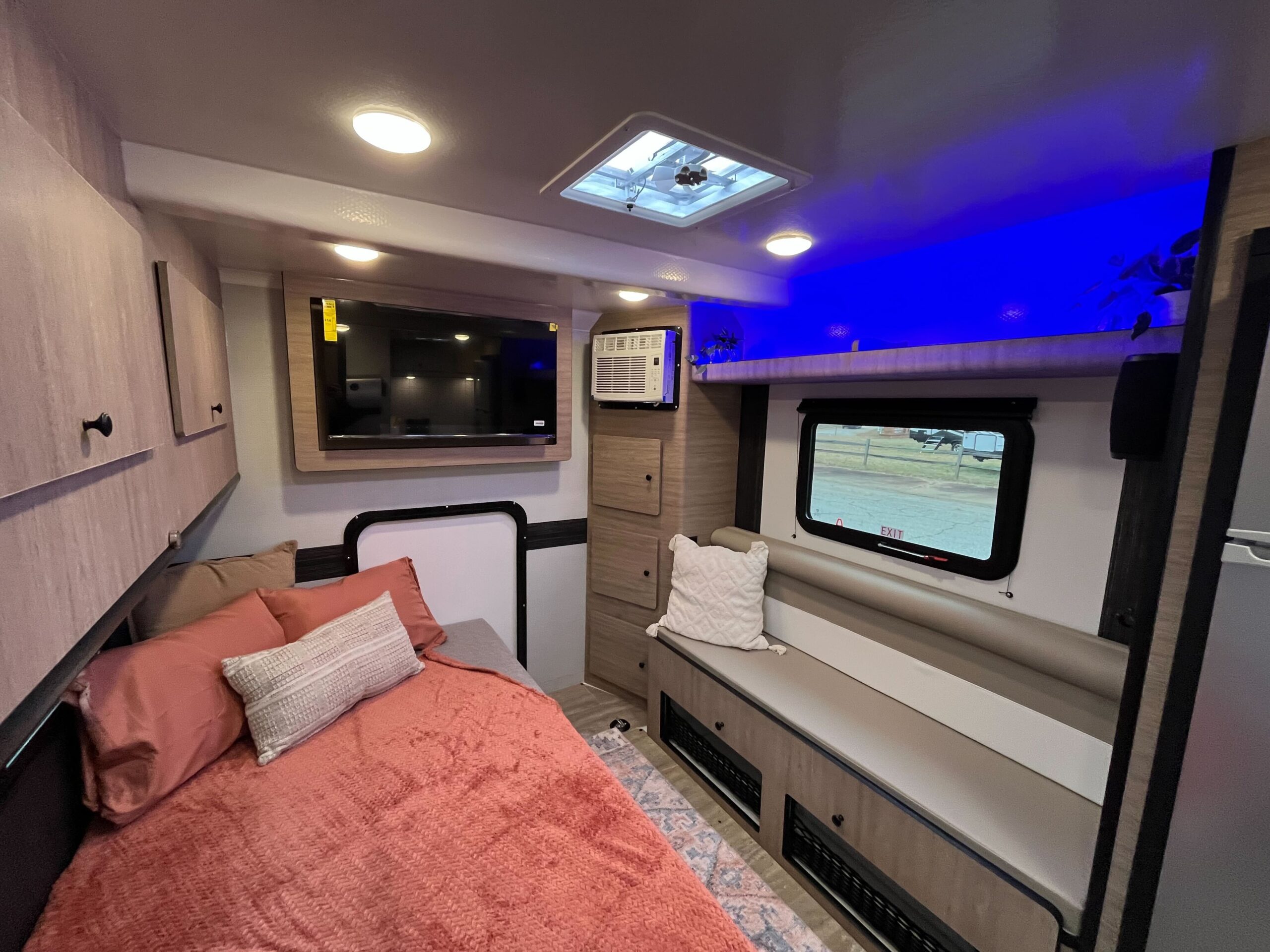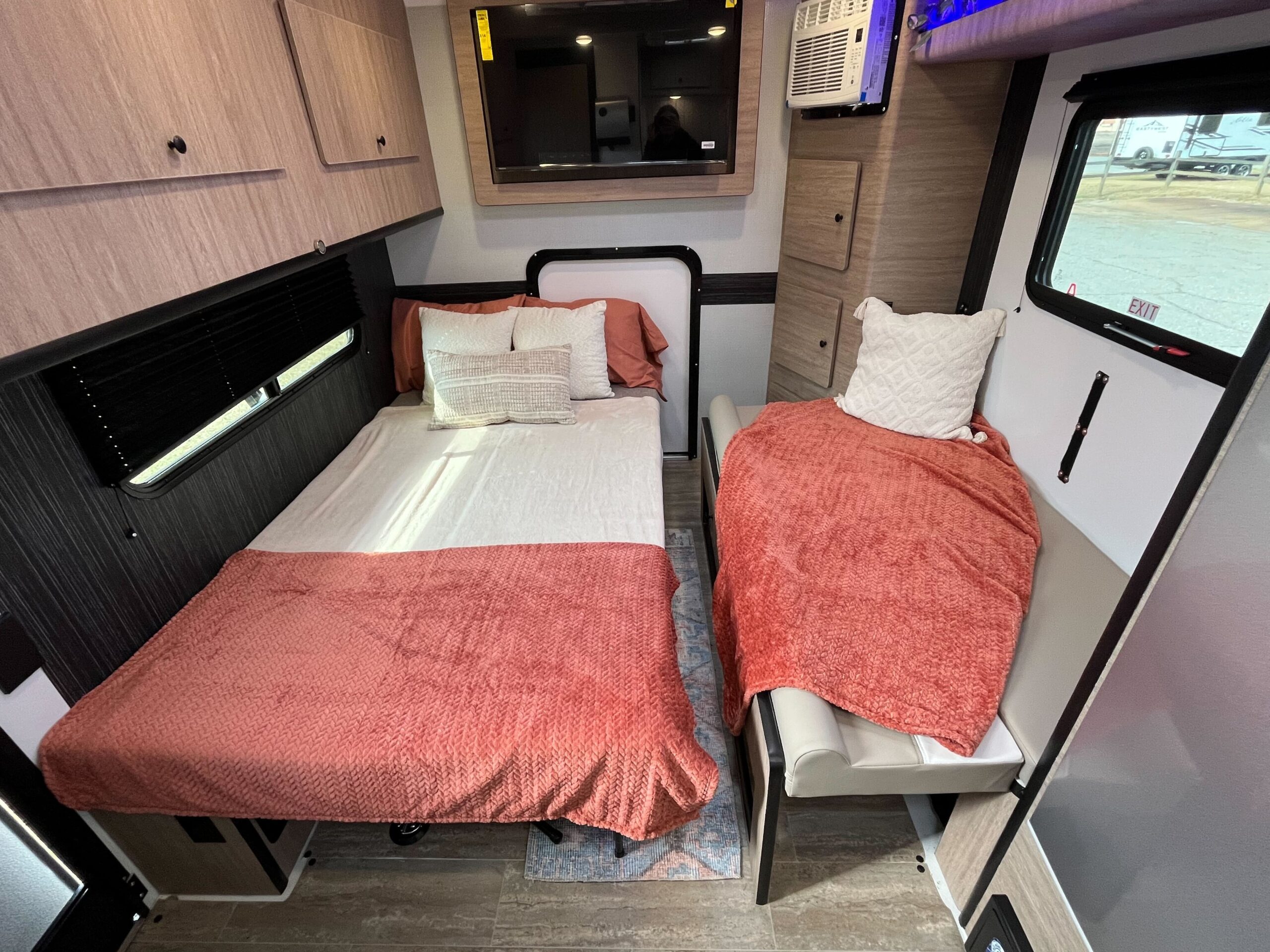 GOUCHO SOFA THAT CONVERTS INTO A BED, FULL-SIZE RV MURPHY BED, BICYCLE DOOR, TONS OF STORAGE, TIE DOWNS FOR BICYCLES.